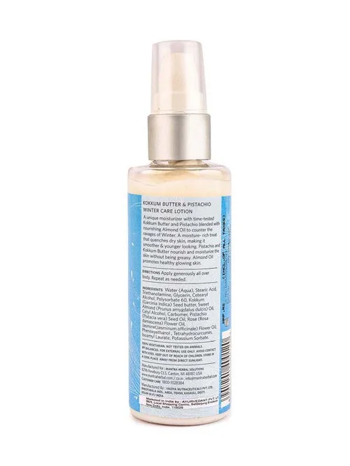 Mantra Herbal Kokum Butter and Pistachio Winter Care Lotion is a nourishing skincare product designed to combat the dryness and discomfort associated with winter. Kokum butter provides deep hydration and helps in maintaining the skin’s moisture balance. Pistachio, rich in antioxidants and vitamins, promotes skin health and suppleness. This lotion is a perfect choice to keep your skin moisturized, soft, and protected during the cold winter months, making it an essential addition to your winter skincare routine.