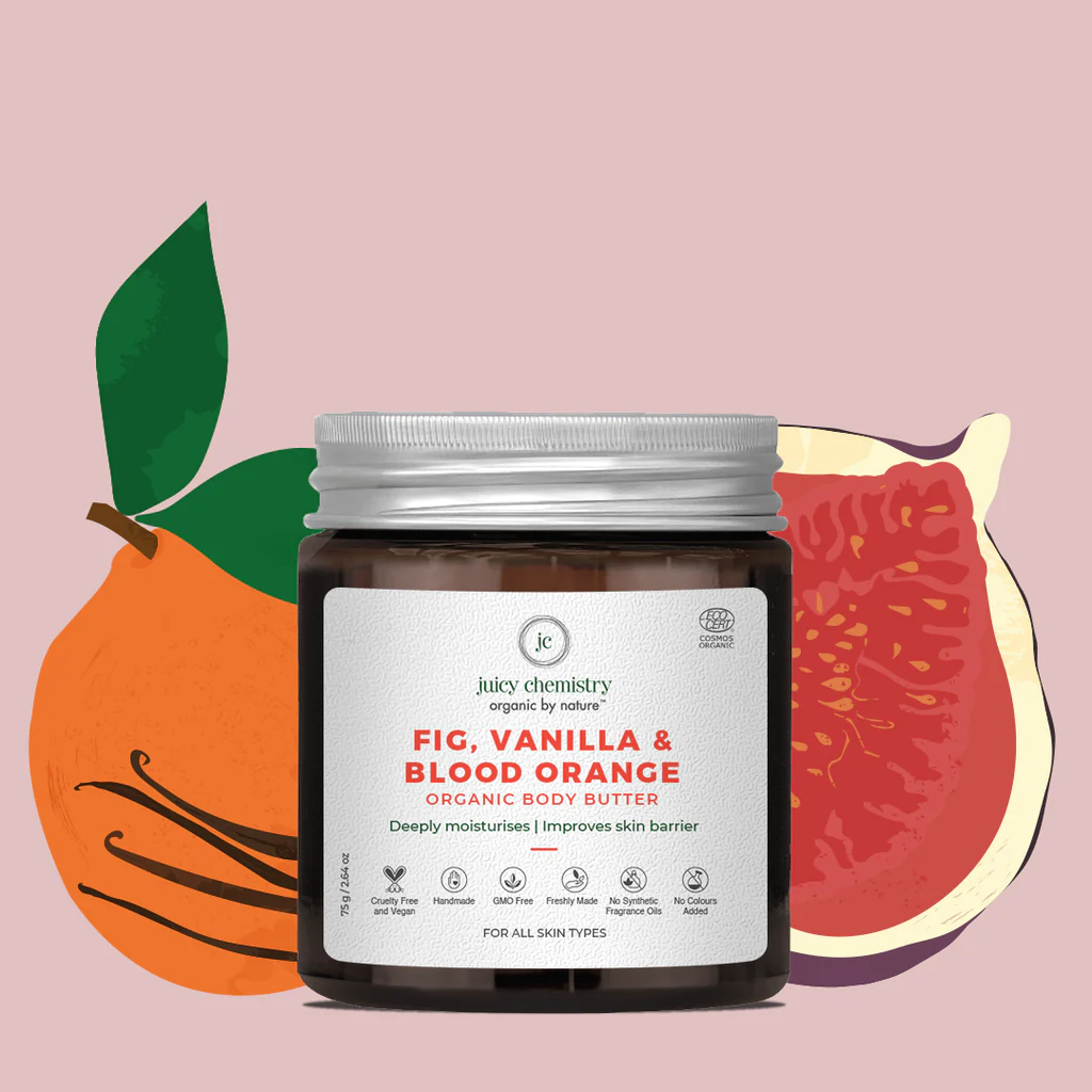 Juicy Chemistry Fig, Vanilla, and Blood Orange Body Butter is a sumptuous treat for your skin. This rich body butter is infused with the delightful scents of fig, vanilla, and blood orange. It offers deep hydration and leaves your skin feeling velvety-smooth and beautifully fragrant, making it a luxurious addition to your skincare regimen.