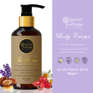 Introducing “Body Crème,” a premium paraben-free body lotion handcrafted using organic and natural ingredients. This intense body moisturizing lotion is infused with Shea Butter, Organic Coconut, Organic Jojoba, and Organic Almond oils, known for their rich Vitamin E content and natural skin moisturizing properties. It effectively keeps dry, flaky skin soft, hydrated, and nourished from within, making it an ideal choice for those seeking an organic body lotion for dry skin, body milk for dry skin, or a body lotion for the winter season.
