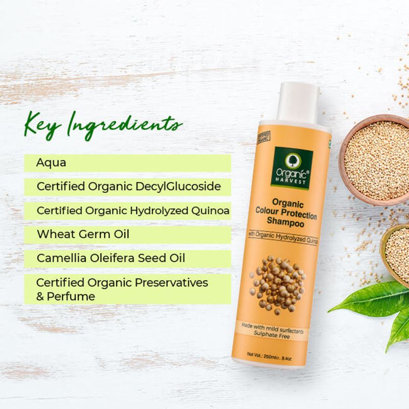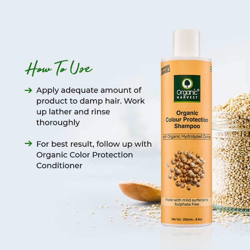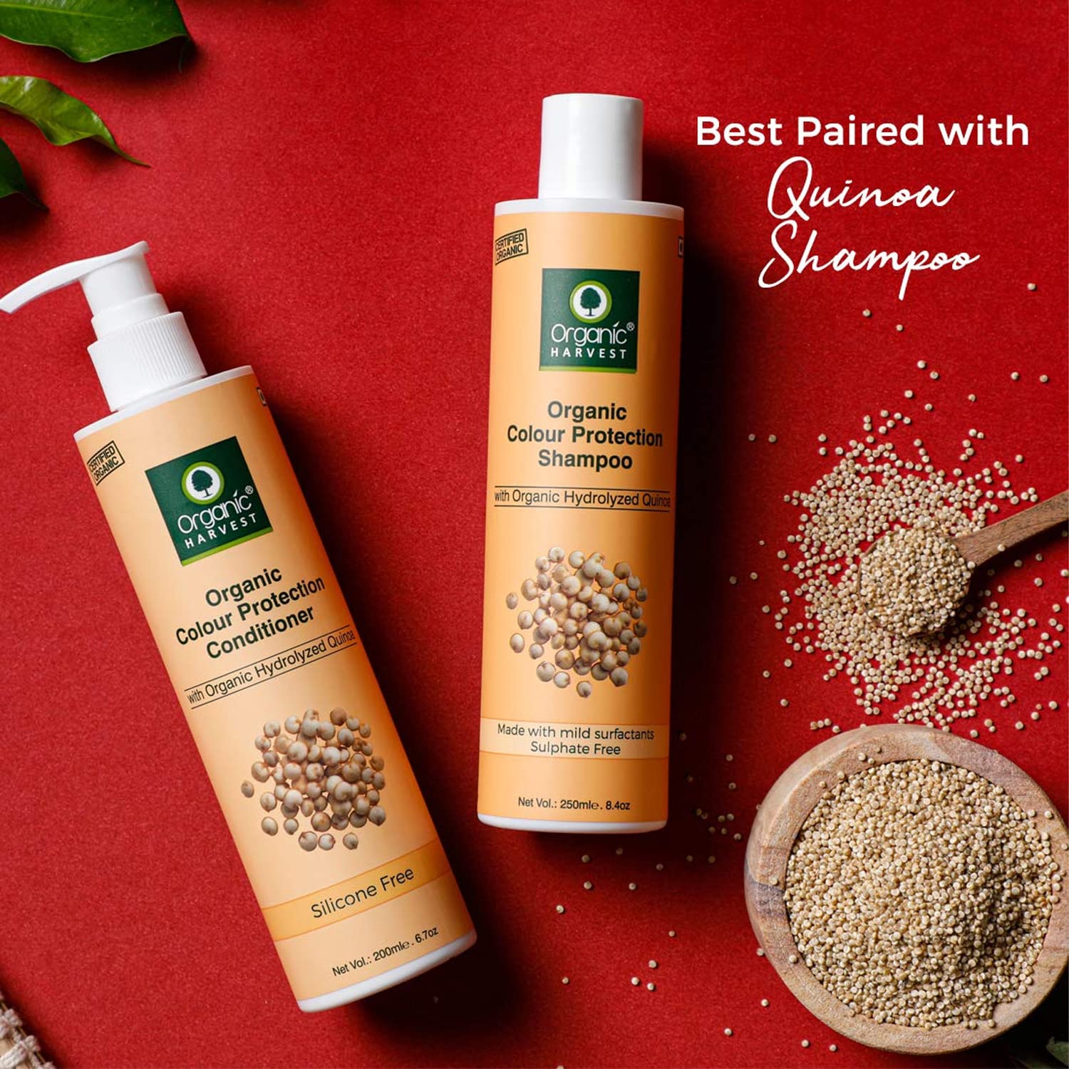 Introducing the Organic Harvest Hydrolyzed Quinoa Color Protection Shampoo, available on Faasha.com. This vegan, herbal, and organic shampoo is specially formulated to retain hair color, provide conditioning, and offer overall protection for your tresses. It harnesses the power of natural protein derived from quinoa, making it an ideal choice among other color protection shampoos in the market.